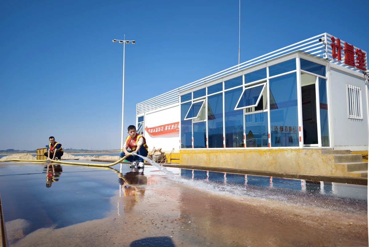 10點(diǎn),在地磅上,萬騰達(dá)和郭陶源正在手持高壓水槍,一遍又一遍地沖洗著地磅上的余砂。原來,上午運(yùn)砂車輛排起了長龍,一輛接著一輛過磅,每輛過磅的車都會帶著部分泥沙、積水,地磅積累太多砂石,如不及時清理,貨車過磅時數(shù)據(jù)差異也將增大,為保證數(shù)據(jù)的準(zhǔn)確性,當(dāng)無車輛上磅時,他們就會迅速拿起鐵鍬或高壓水槍清理地磅上的沙子和泥。