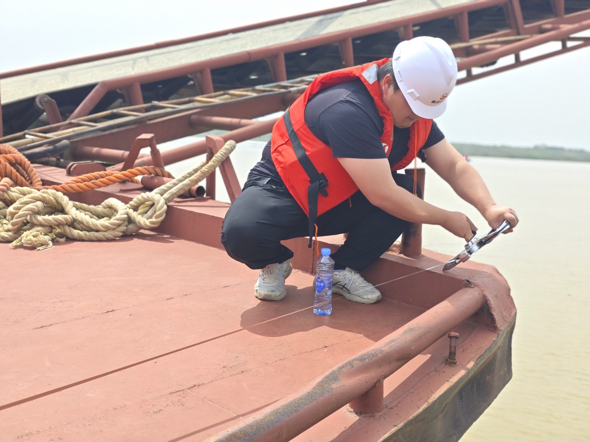 需要測量的運(yùn)輸船一般停在離堤岸100多米的江面上,量船人員必須先乘坐小船,靠近運(yùn)輸船船體后大家陸續(xù)通過懸掛在船沿上的鐵梯爬上距水面兩米多高的運(yùn)輸船,對一般人來說有著一定的難度。
