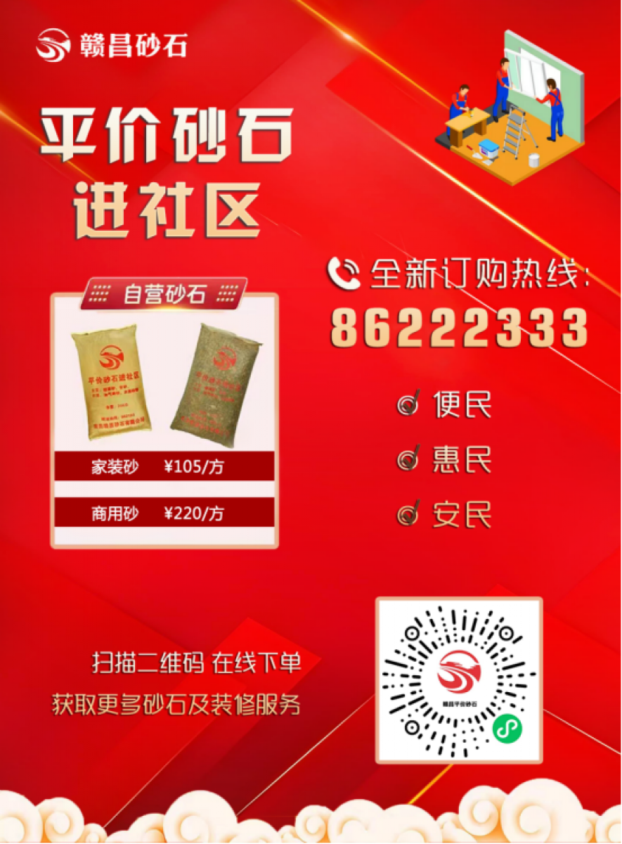 原熱線962133將于2024年7月15日停止服務(wù),請(qǐng)廣大客戶知曉,并互相轉(zhuǎn)告,如給您帶來(lái)不便,敬請(qǐng)諒解。贛昌砂石公司將繼續(xù)秉承“便民、惠民、安民”服務(wù)理念為全市家裝客戶提供平價(jià)砂石配送服務(wù),無(wú)論您身處哪個(gè)社區(qū),一個(gè)電話,平價(jià)砂石到您家。